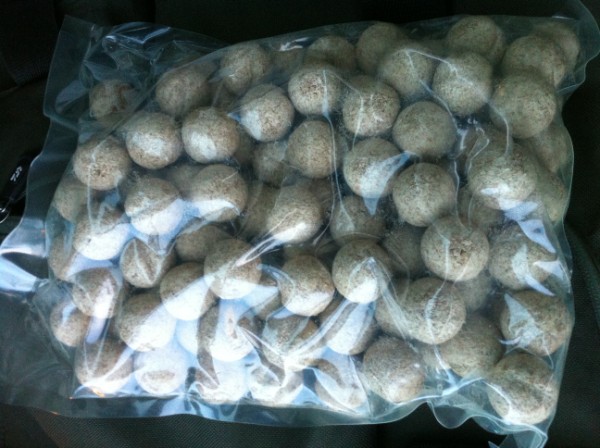 A verseny előtt jött az ötlet – bojli őrlővel le kell darálnom és azt kell a kosárba töltenem. A verseny reggelén kaptam meg a tóparton a 3 kg bojlit (egy STÉG-es barátomtól, akinek innen is köszönöm), amit az etetéshez és a kosárba töltéshez használhattam. Alapetetésnek a szokásos aromásított magmix mellé halibut és ananászos etetőpelletet kevertem – de most először durvára őrölt vaníliás bojli is került bele. Csak hogy szokják a halak.