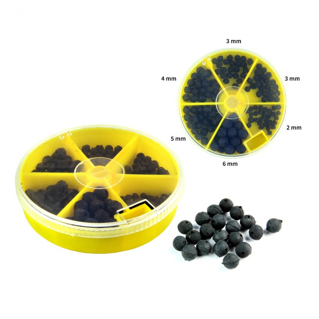 2, 3, 4, 5 és 6 mm-es gumigyöngyök szortiment dobozban, amelynek tetjét forgatva adagolhatjuk a kívánt méretet.