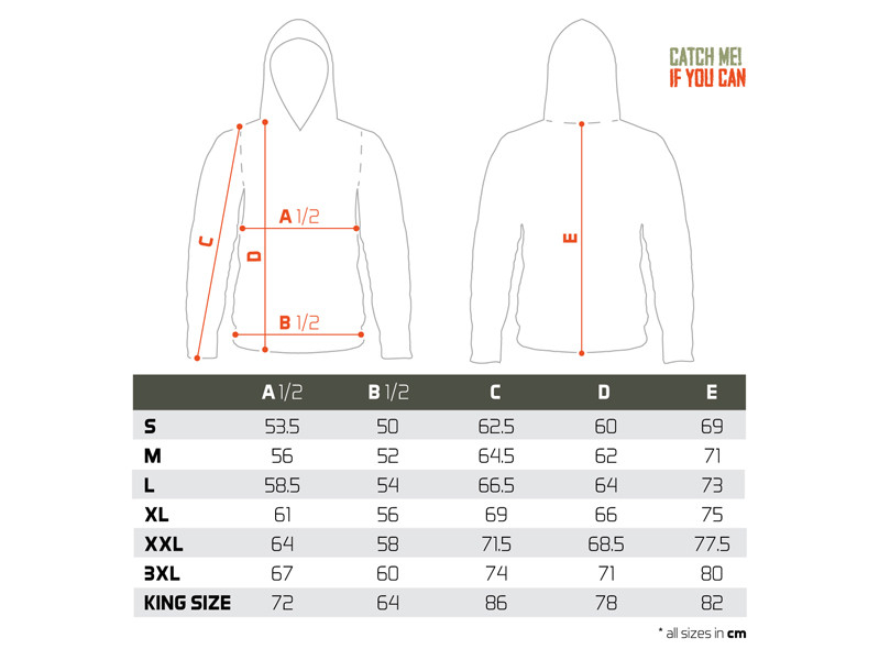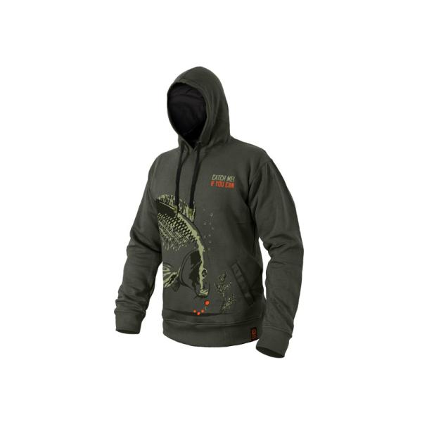 A ponty dizájnt felvonultató CATCH ME IF YOU CAN sorozat nem csak a horgászszekrények kiemelkedő darabja. A ponty motívum körbeveszi a törzs alsó részét, vázlatként vagy festményként jelenik meg, miközben minden lényeges részletet megtart. A hal épp egy maroknyi bojlit közelít meg – ez pontosan az a pillanatban, amire a horgászok várnak. A kapucnis pulóver sötétzöld színű, feltűnő narancssárga és világoszöld grafikával.