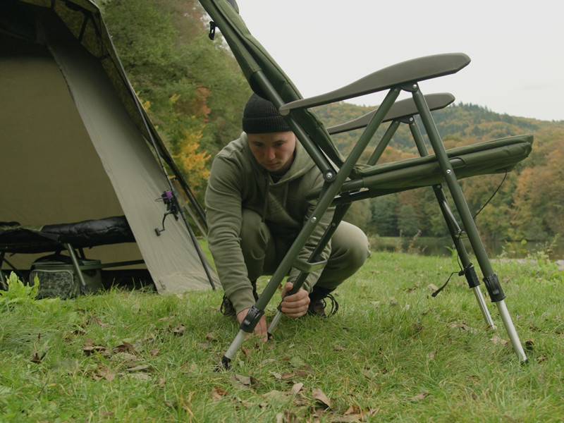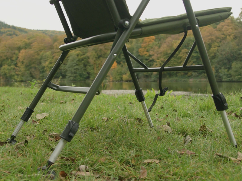 A teleszkóposan állítható lábaknak köszönhetően a szék könnyedén alkalmazkodik az egyenetlen terephez, és stabilan áll még nehezebb körülmények között is. A rugalmas, nagy felületű, masszív tappancsok megakadályozzák, hogy a lábak belesüllyedjenek a puha talajba a vízparton. Emellett a szék egy műanyag rögzítőcsipesszel is el van látva, amely szállítás közben biztonságosan összetartja, így véletlenül sem nyílik ki.