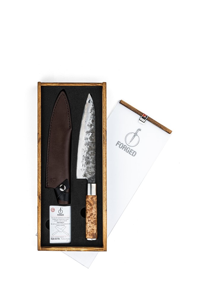 Köszönhetően a penge kialakításának, a gyönyörű csomagolásnak és a tradicionális gyártási folyamatnak, a Forged márka minden kés szerető szívét megdobogtatja. A késeket teljes mértékben kézzel gyártják, japán acélból készülnek és égetett luxus fa dobozba kerülnek eladásra.