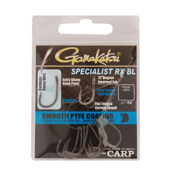 Bármely horgásztavon bevethető kiváló minőségű pontyozó horog. A Gamakatsu Specialist RX pontyozó horog szakáll nélküli kialakítású, így a legszigorúbb tavi horgászrendeknek is megfelel. A 12-es méretet akár már feeder botokra is javasoljuk a 8-10mm-es csalikhoz.