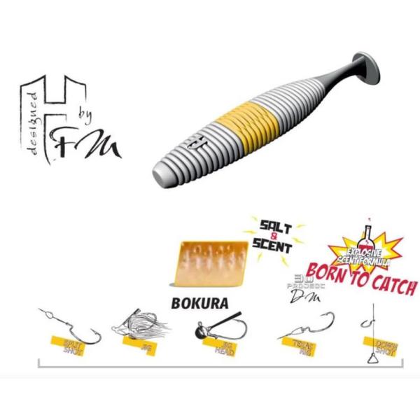 Masszív test, shad farokkal. A 10,5 cm-es, széles lapos gyűrűs test olyan rezgéseket kelt, amit a süllő, csuka és balin már messziről megérez.