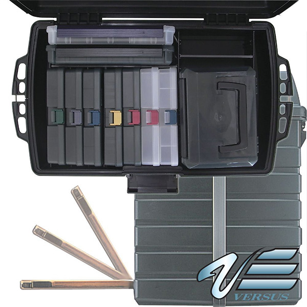 A masszív fedél alatt egy 12cm mély tárolót találsz, amit igényeidnek megfelelően oszthatsz – szeparálhatsz a hozzáadott „lemezekkel”. Persze ezt is telepakolhatjuk dobozokkal: VS-820, VS-704, VS-804