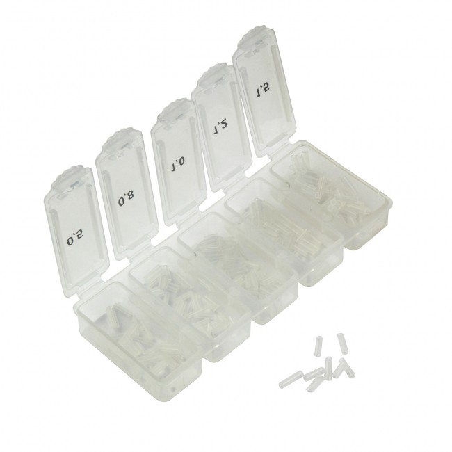 Az összesen 240 darabos készlet mérettartalma: 1.5, 1.2, 1.0, 0.8, 0.5, 0.3 mm-es szilikoncsövek.