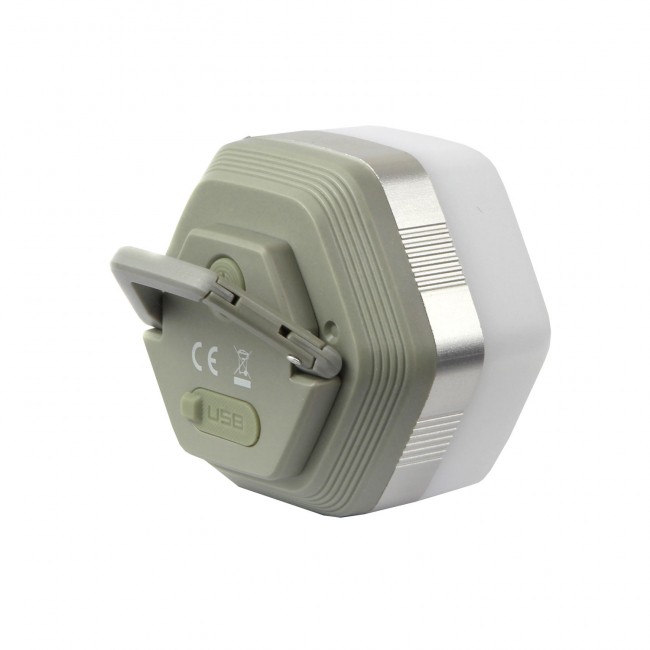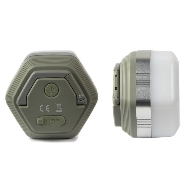 350 lumen fényerejű, beépített akkumulátorral rendelkező tábori lámpa.
