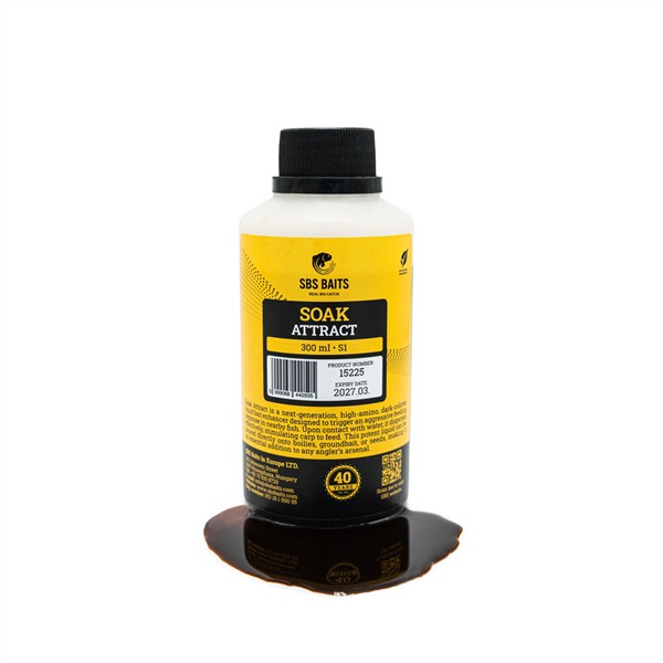 A Soak Attract egy új generációs, rendkívül hatékony, magas amino tartalmú, agresszív, sötét színű folyadék, amely a vízbe érve táplálkozásra bírja a közelében lévő halakat. A folyadékot akár közvetlenül csalira, etetőanyagra, vagy az etetésre szánt magokra is önthetjük. Különlegessége, hogy az előállítása egyedi és különleges gyártási folyamat eredménye, amely semmilyen más készítménnyel nem utánozható. A folyadék első prototípusának tesztelésére már 2022-ben sor került. Már ekkor kiemelkedő eredményeket értünk el vele, hiszen ebben az évben az SBS-Xtra Carp Team nyerte az Országos Pontyfogó Bajnokságot. A folyadék a végső formáját 2024-ben érte el, amikor a szlovákiai SBS csapat figyelemre méltó eredményt produkált a Sirava-tavon tartott bojlis versenyen. A siker kulcsát a Soak Attract S1 folyadékban áztatott bojlik jelentették.