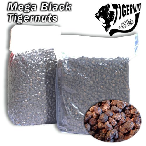 Fekete Tigrismogyoró XXL-es méretben, mely kiváló tápértékű ponty csali, méretéből adódóan akár szelektáló képességgel is rendelkezik. A Fekete a tigrismogyoró félék egyik nagyra növő fajtája, melynek beltartalma is gazdagabb, mint a hagyományos típusnak. Magasabb cukor és nyers fehérje tartalommal bír, mint más típusú rokonai. Áztatás és főzés utáni állapota elérheti a 18-28mm-es nagyságot is, ezáltal kedvenc csemegéje a nagy testű pontyoknak, amuroknak. A fekete külső belül világos krém színt takar.