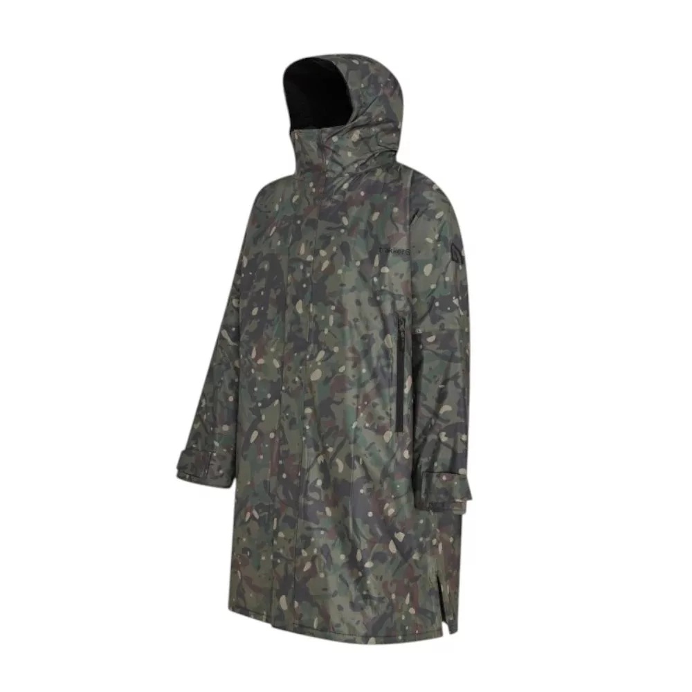 A Trakker CR Camo Robe rendkívül vízálló, 5000 mm-es hidrosztatikus fejű külső anyagból készült, teljesen ragasztott varratokkal; ez az esőkabát maximális védelmet biztosít az időjárási viszontagságok ellen. A cipzáras, polárral bélelt kézmelegítő zsebek és a rendkívül vastag sherpa polár bélés kiváló hőszigetelést biztosítanak. A sherpa polárral bélelt kapucni további meleget és védelmet nyújt, míg az állítható mandzsetták kényelmes illeszkedést biztosítanak.